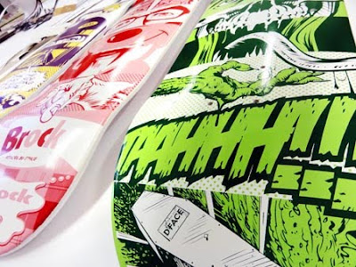 Available NOW… Set of 3 x 2 Colour screen printed decks by D*Face in collaboration with Real Skateboards, limited edition of 10 sets only. 5 sets available for sale from StolenSpace.